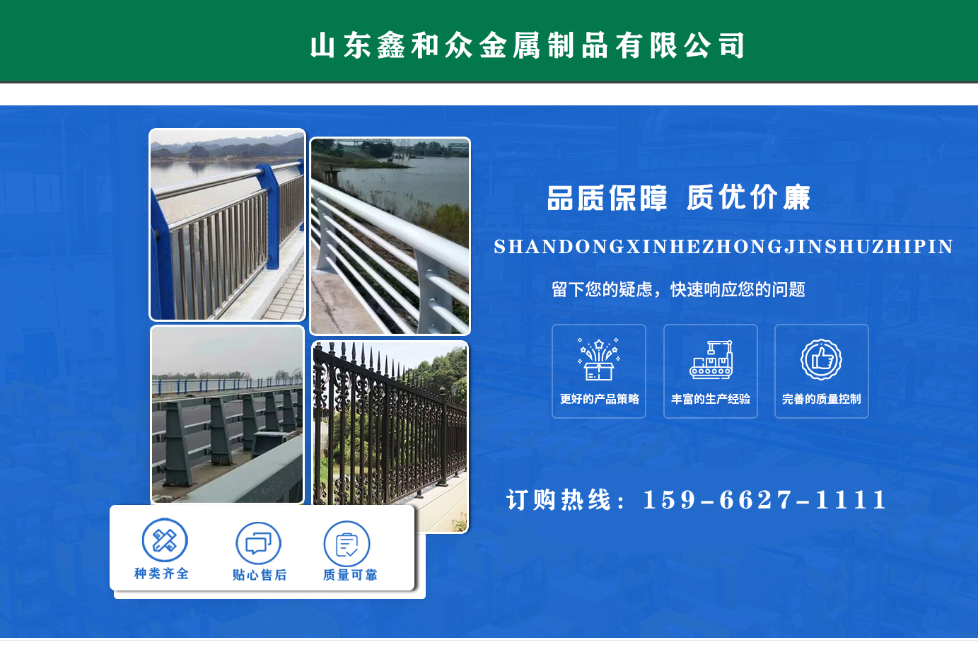山東鑫和眾金屬制品有限公司主要產(chǎn)品有防撞護(hù)欄,橋梁護(hù)欄,道路護(hù)欄,河道護(hù)欄,不銹鋼護(hù)欄等護(hù)欄。提供設(shè)計(jì)方案,一站式定制,包您滿意價(jià)格優(yōu)惠,歡迎來電咨詢! 公司常年從事銷售護(hù)欄防撞護(hù)欄,橋梁護(hù)欄,道路護(hù)欄,河道護(hù)欄,不銹鋼護(hù)欄,橋梁鋼護(hù)欄,河道燈光護(hù)欄等。產(chǎn)品廣泛應(yīng)用于橋梁、河道、旅游景區(qū)、道路、公路、公園、小區(qū)、景觀、道路防撞等領(lǐng)域。 公司產(chǎn)品均采用優(yōu)質(zhì)不銹鋼材料,符合相關(guān)標(biāo)準(zhǔn)。各種型號(hào)不銹鋼復(fù)合管及護(hù)欄,質(zhì)量嚴(yán)格把控。產(chǎn)品強(qiáng)度高、耐腐蝕、焊接牢固、抗沖擊、性能好,防撞護(hù)欄結(jié)構(gòu)簡(jiǎn)單、美觀實(shí)用大方。 歡迎前來訂購(gòu)!...